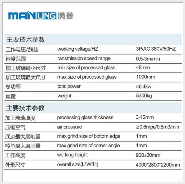 该机器适用于加工家具,建筑等各类型的平板玻璃的批量加工,具有加工速度快,抛光亮度高和加工玻璃尺寸精度高等特点,双直线导轨和双滚珠丝杆的高度精密,操作简单的人机界面和PLC控制系统,可选装LOW-E除膜M和安全角C。